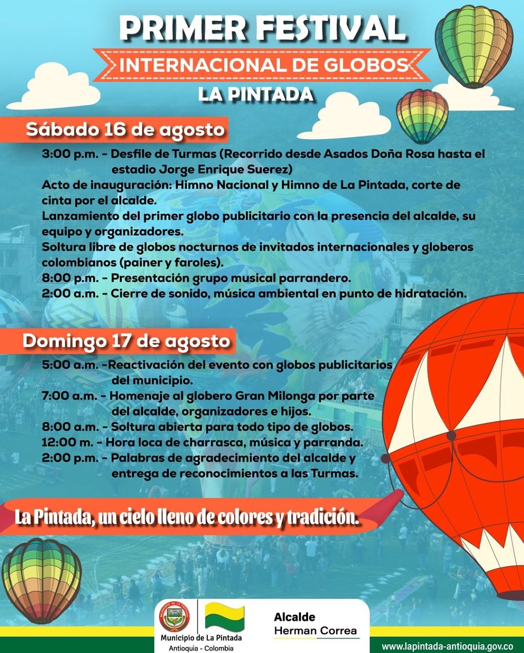 La Pintada se llenará de magia, colores y tradición en el Primer Festival Internacional de Globos. Los días 16 y 17 de agosto disfruta de desfiles, música, cultura y un cielo iluminado por espectaculares globos. Un encuentro único con invitados internacionales, actividades familiares y mucha alegría para vivir juntos.