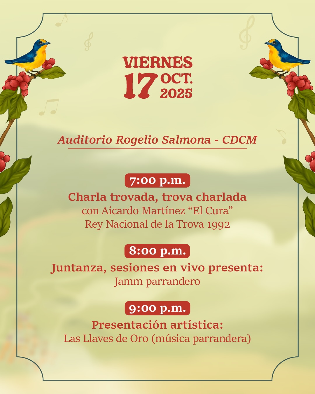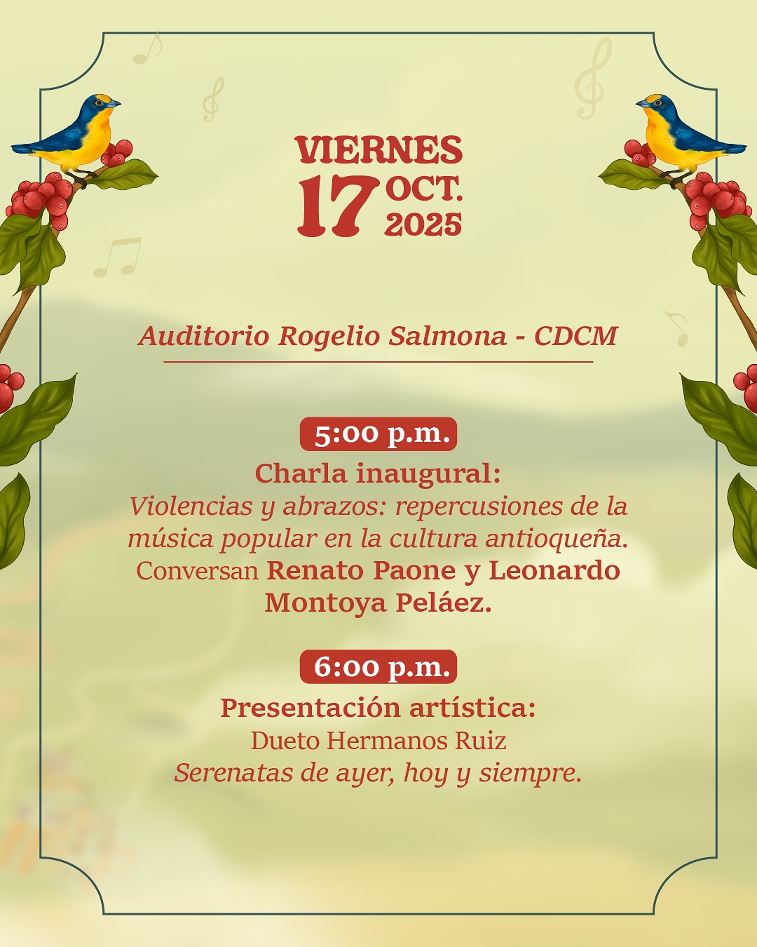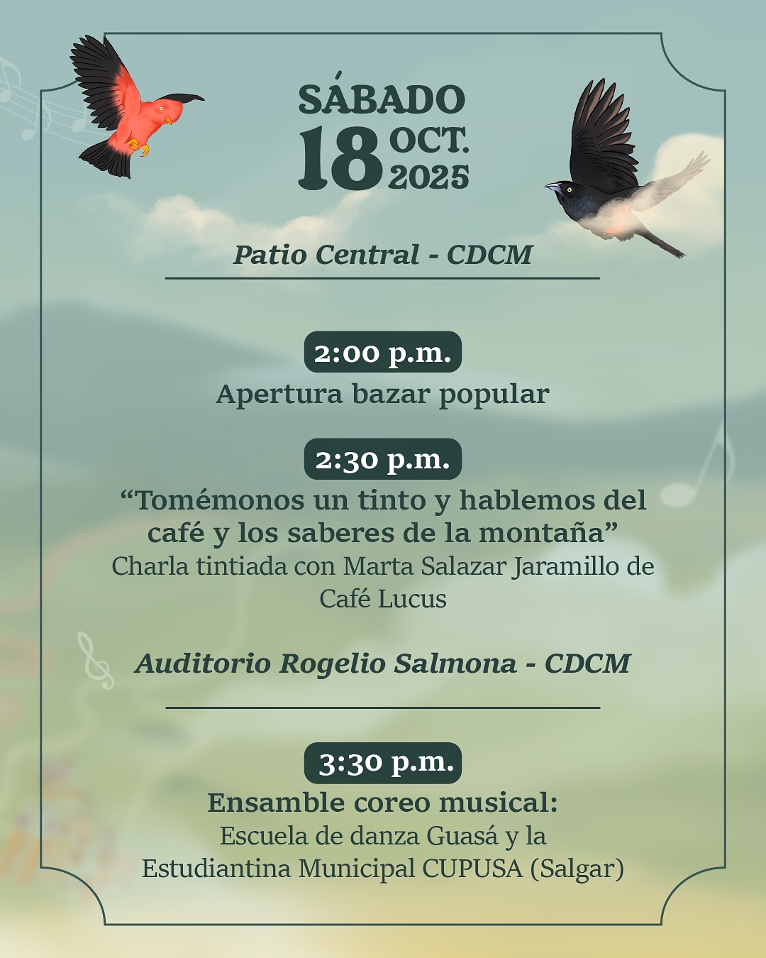 Ven a disfrutar de dos días llenos de charlas, conciertos, muestra gastronómica y actividades culturales que celebran la riqueza del campo, el poder de la palabra cantada y la memoria cafetera.