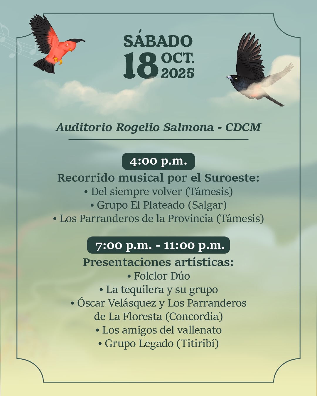 Este año, el festival tendrá como paisaje cultural invitado al Suroeste antioqueño, una región que nos compartirá sus músicas, danzas, saberes ancestrales y sabores como parte de un diálogo vivo con las expresiones campesinas del territorio.