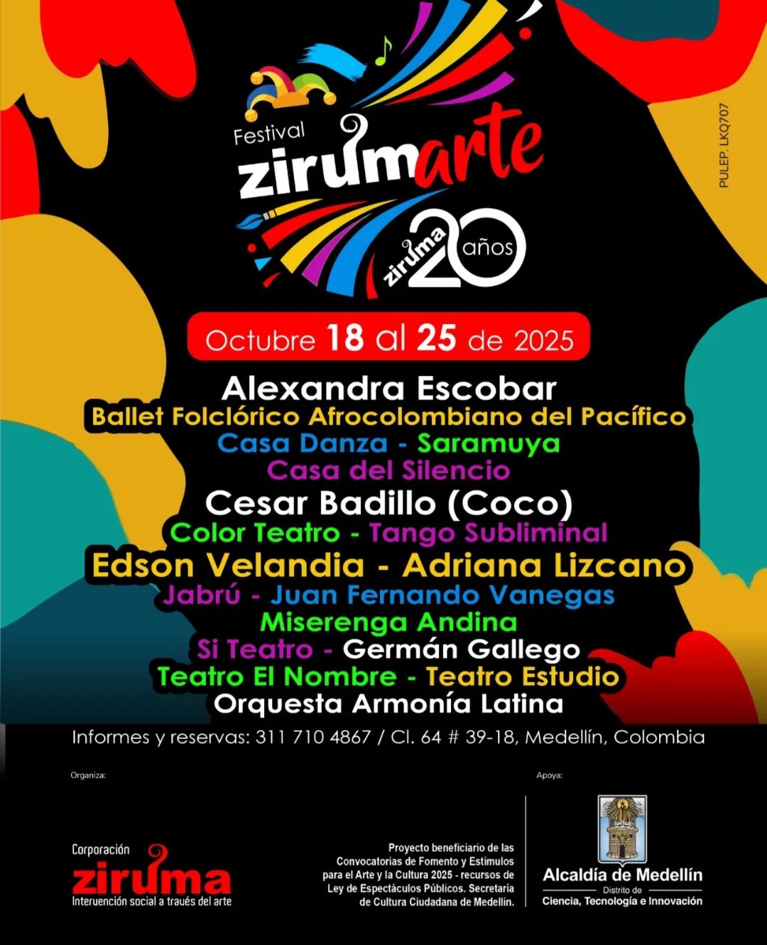 La Corporación Ziruma conmemora dos décadas de intervención social a través del arte, reuniendo grandes talentos como Edson Velandia, Adriana Lizcano, Alexandra Escobar, Casa del Silencio, Teatro el Nombre, Jabrú, César Badillo (Coco) y muchas agrupaciones más que han sido parte del tejido escénico de esta casa cultural.