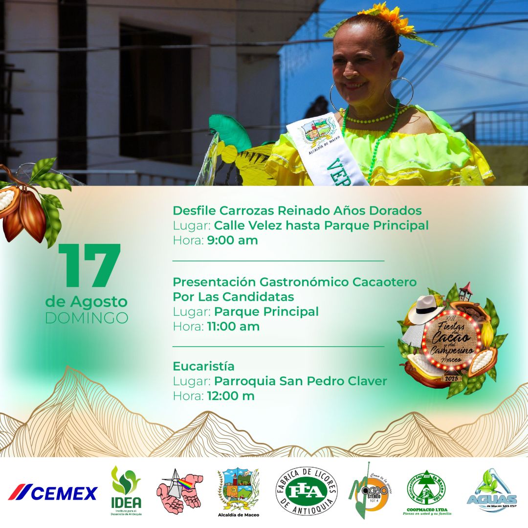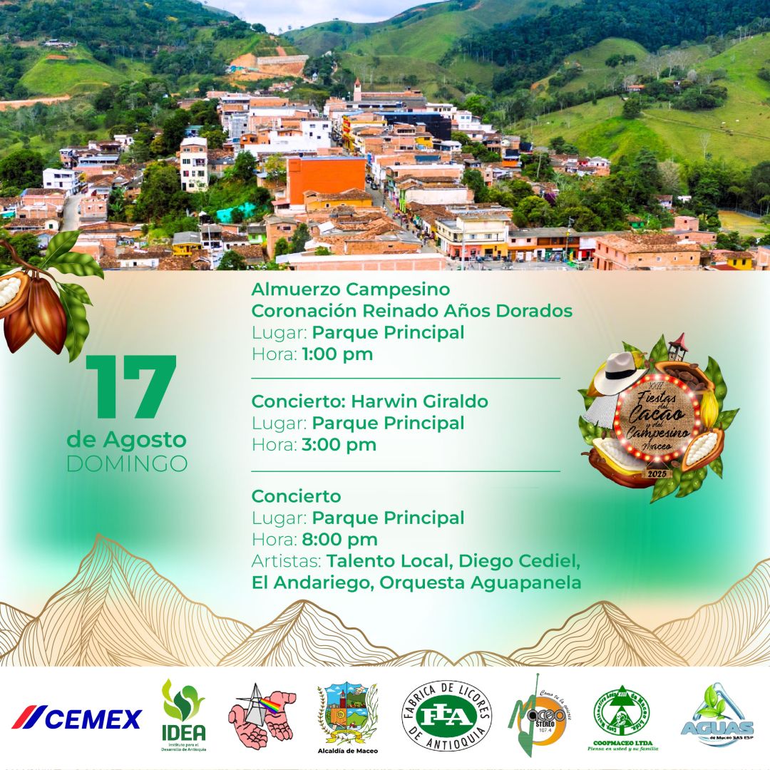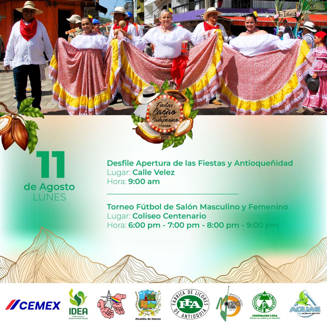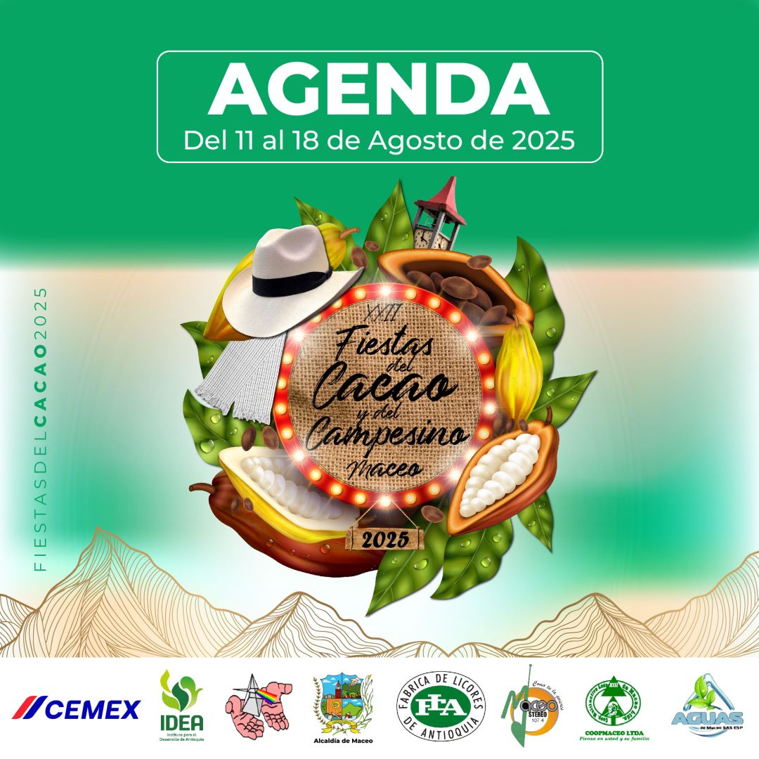 Del 11 al 18 de agosto, Maceo se viste de fiesta para celebrar las XXII Fiestas del Cacao y del Campesino 2025. Un homenaje al trabajo del campo, a nuestras raíces y al fruto que endulza el mundo: el cacao. Disfruta una semana llena de música, danza, gastronomía, desfiles, muestras culturales y el calor humano que caracteriza a nuestra tierra.