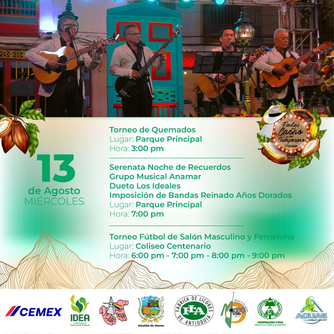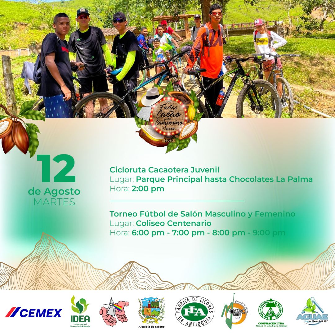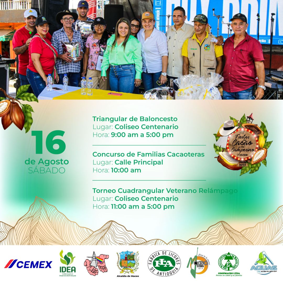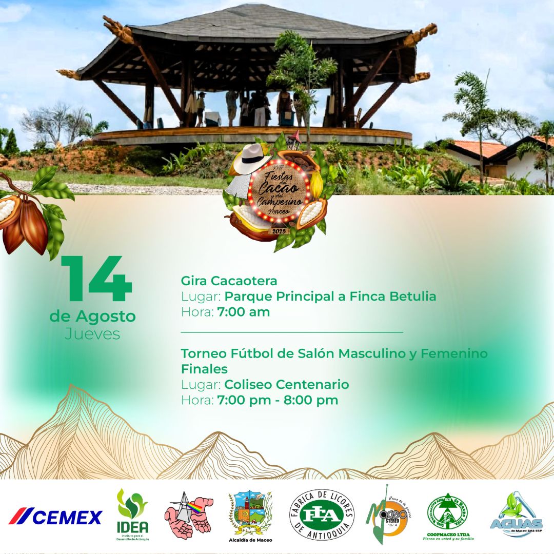 Del 11 al 18 de agosto, Maceo se viste de fiesta para celebrar las XXII Fiestas del Cacao y del Campesino 2025. Un homenaje al trabajo del campo, a nuestras raíces y al fruto que endulza el mundo: el cacao. Disfruta una semana llena de música, danza, gastronomía, desfiles, muestras culturales y el calor humano que caracteriza a nuestra tierra.