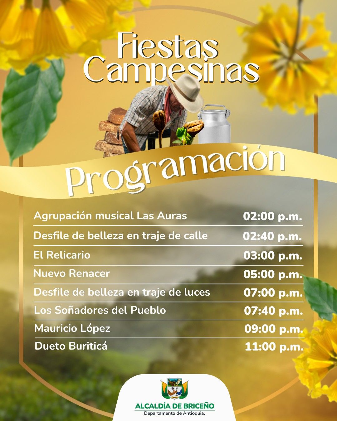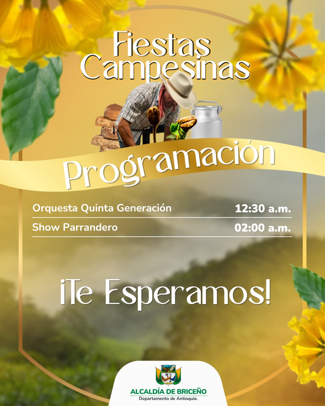 ¡Llegan las Fiestas Campesinas a Briceño, Antioquia! El parque principal se transforma en un escenario lleno de cultura, sabor y tradición. Celebra con nosotros el orgullo campesino y la alegría de ser briceñitas. ¡Te esperamos!