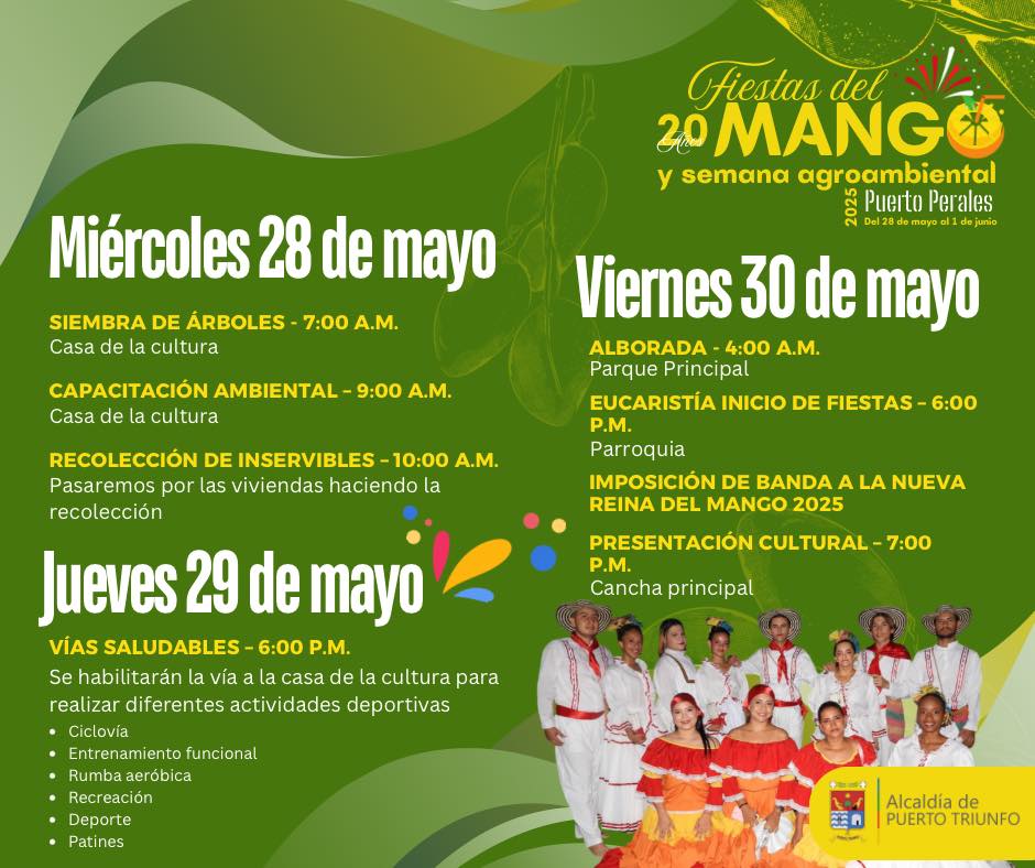 Organiza la Alcaldía de Puerto Triunfo, este evento busca resaltar el valor del mango como símbolo local y promover prácticas sostenibles en la región. ¡Una fiesta para toda la familia que no te puedes perder!