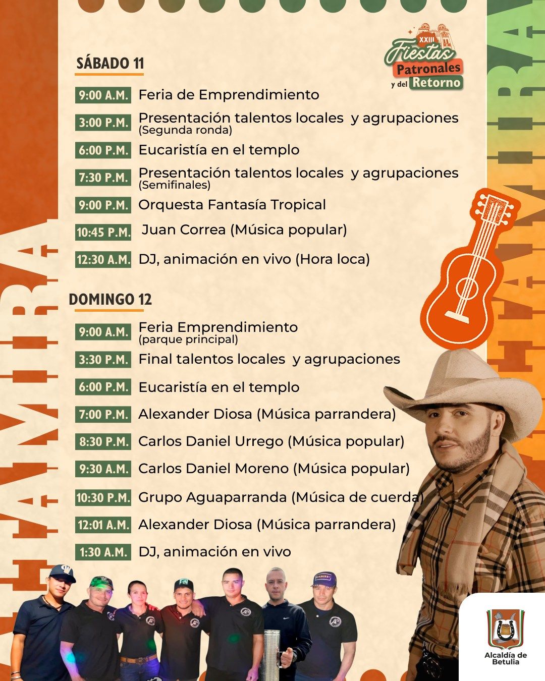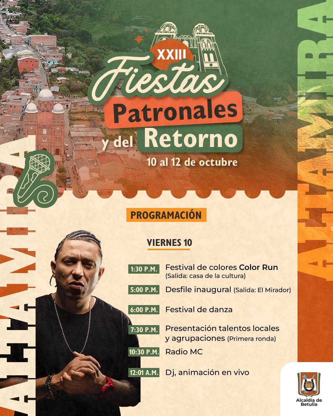 ¡Altamira vibra con emoción! Del 10 al 12 de octubre, las XXIII Fiestas Patronales y del Retorno llenan de vida, música y tradición este hermoso corregimiento de Betulia. Un fin de semana para revivir las raíces, reencontrarse con la tierra que nos une y disfrutar con orgullo vallecaucano de expresiones artísticas, talento local, actividades religiosas, ferias de emprendimiento, danzas, espectáculos musicales y mucho más.