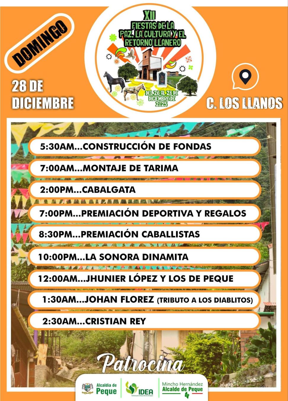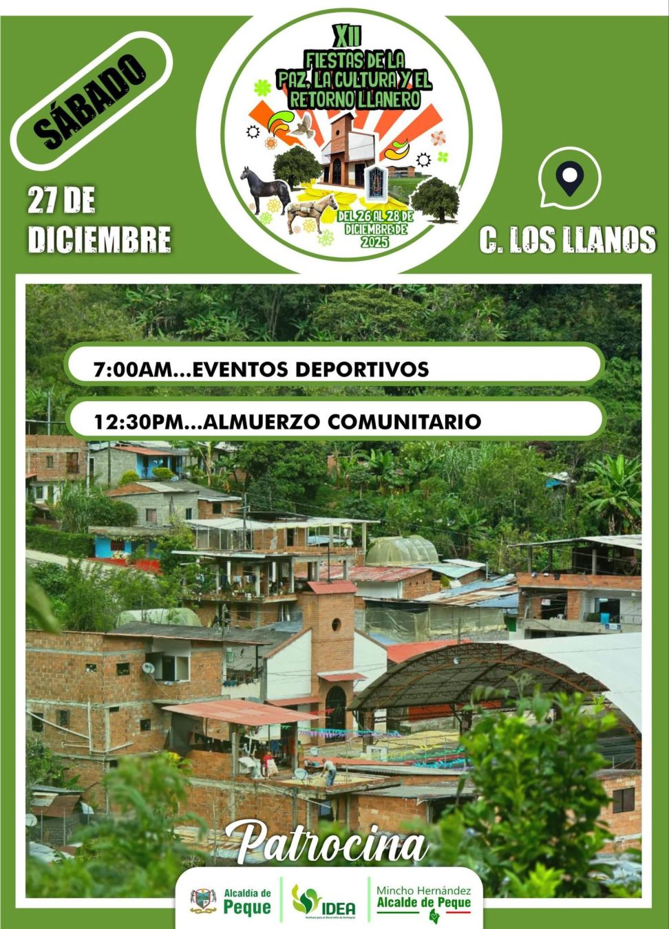 Peque se viste de fiesta con la XII edición de las Fiestas de la Paz, la Cultura y el Retorno Llanero, un encuentro para disfrutar de la tradición, la música y el orgullo campesino. Durante tres días, el corregimiento de Los Llanos será escenario de actividades deportivas, muestras culturales, la tradicional cabalgata y espacios pensados para toda la familia.