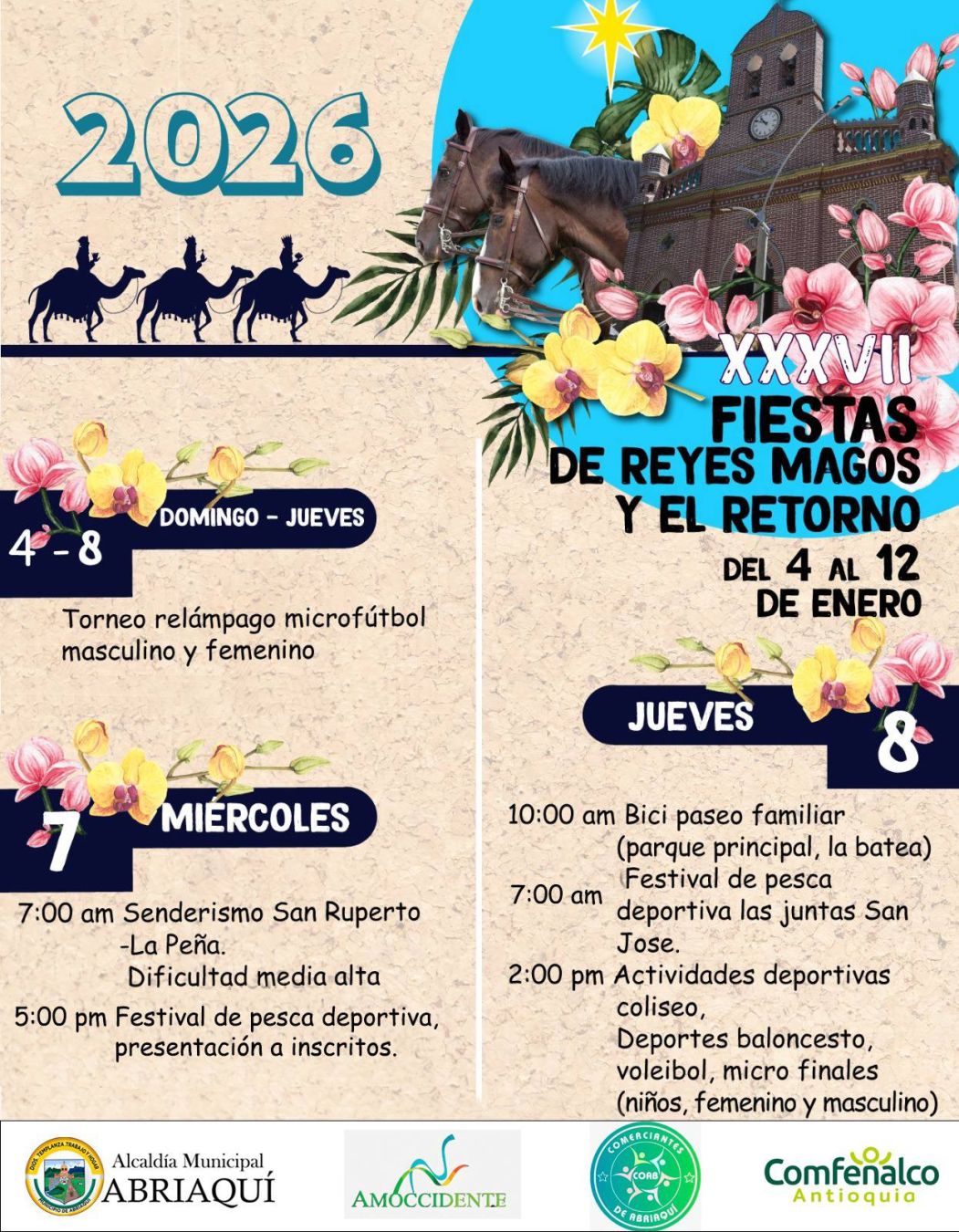 ¡Abriquí se viste de fiesta con la XXXVII edición de las Fiestas de Reyes Magos y el Retorno! Disfruta de una semana llena de tradición, música, deporte, cultura y reencuentros. Vive actividades para toda la familia, presentaciones de artistas, festivales deportivos, muestras culturales, cabalgatas, juegos y mucho más.