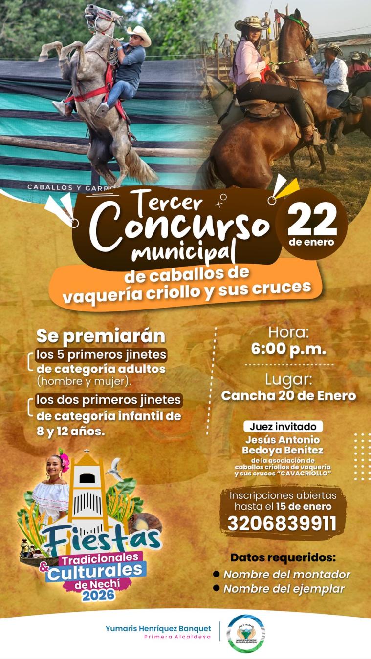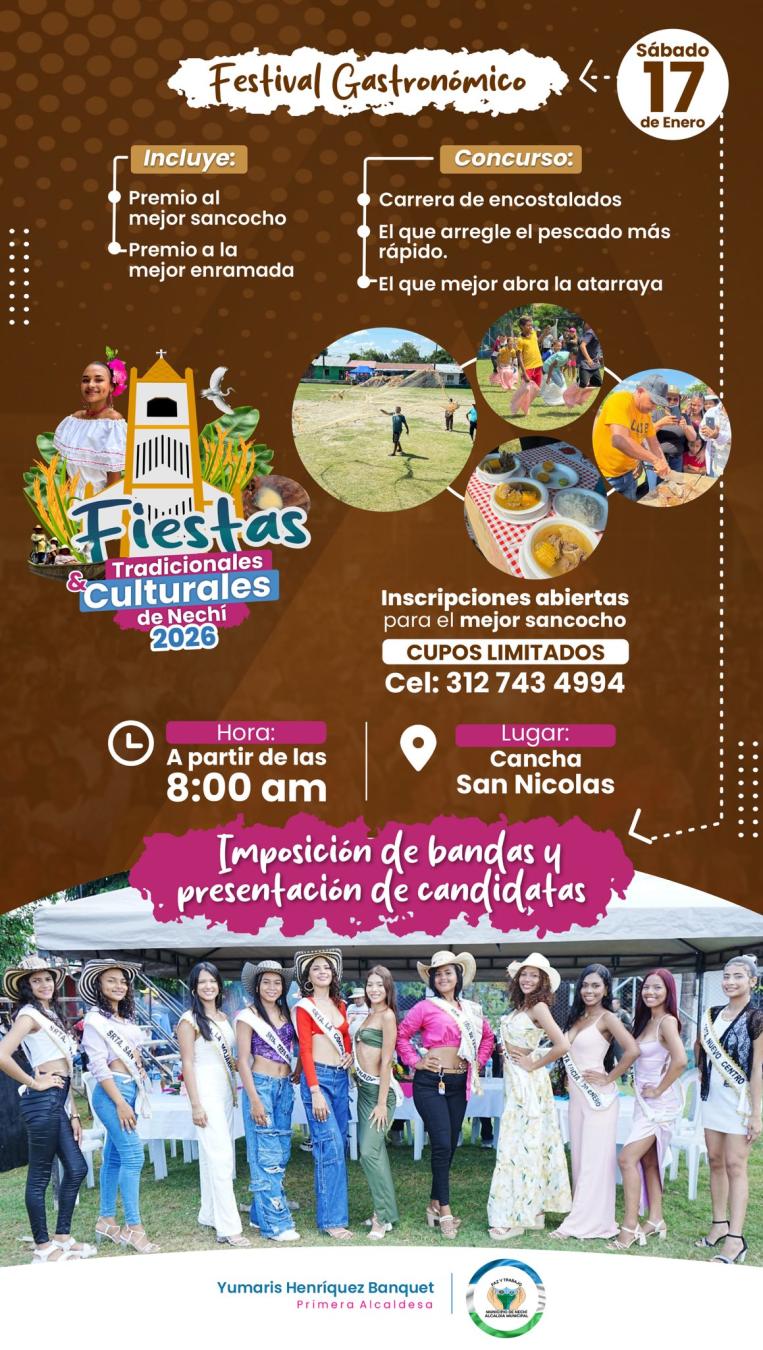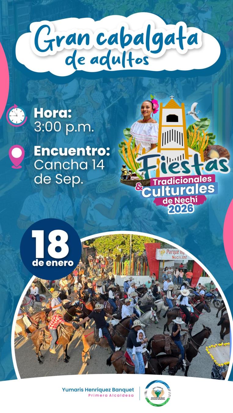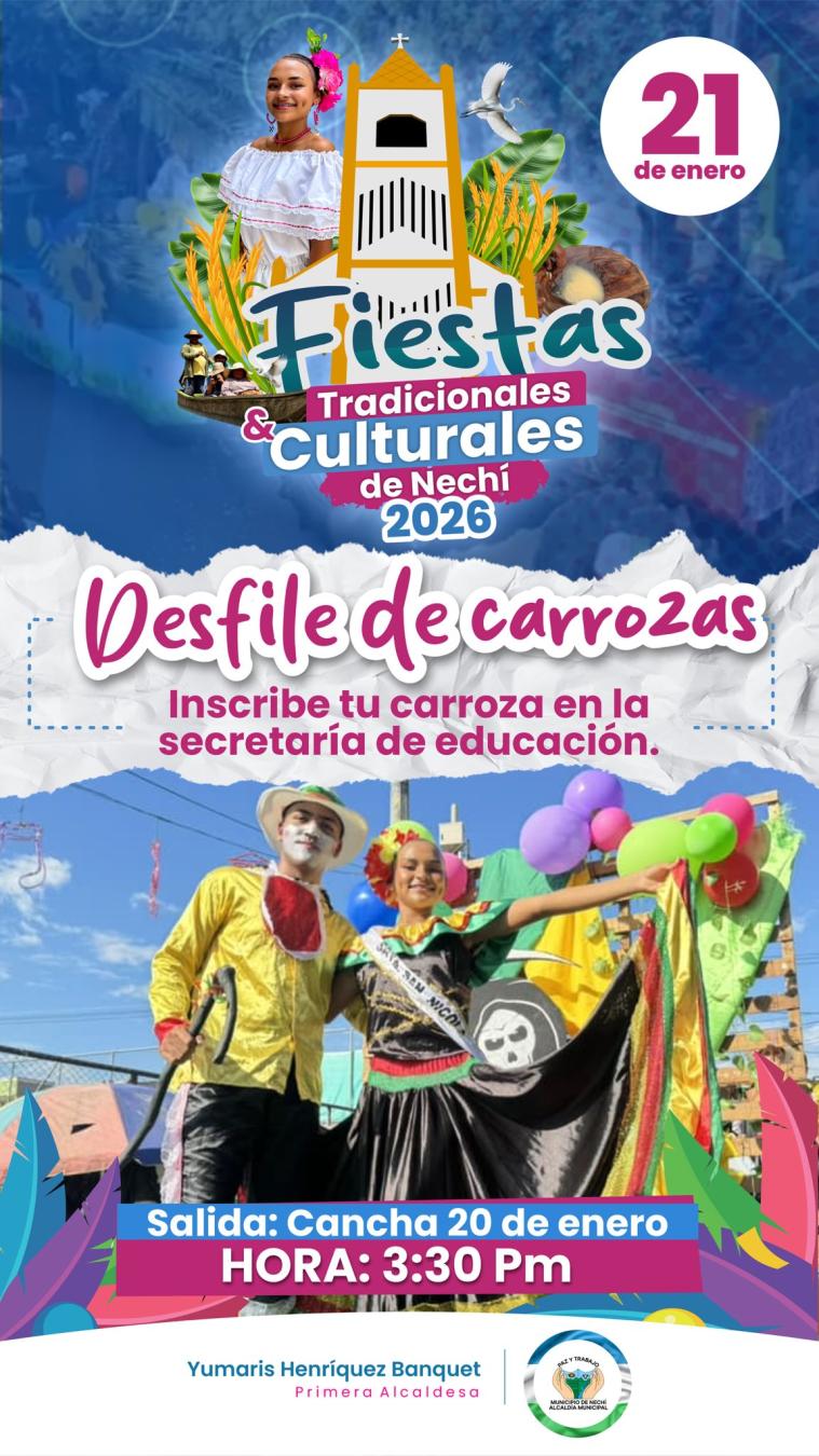 ¡La alegría vuelve a las calles de Nechí! Del 16 al 24 de enero, vive las Fiestas Tradicionales y Culturales de Nechí 2026 con una programación llena de tradición, música, sabor y arte popular. Cada día será una celebración única de nuestra identidad cultural: ciclismo, boxeo, festivales gastronómicos, cabalgatas, porrovía, carrozas, conciertos, noche de talentos y mucho más.