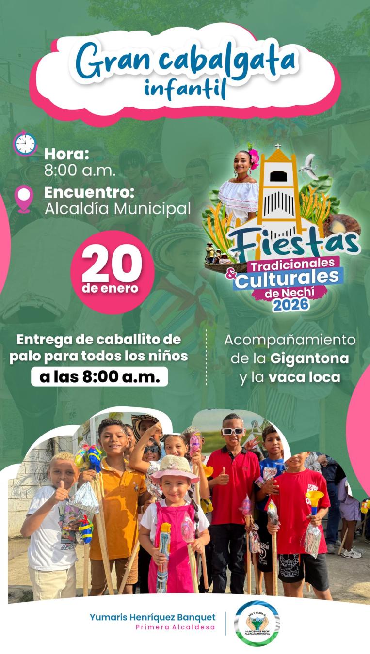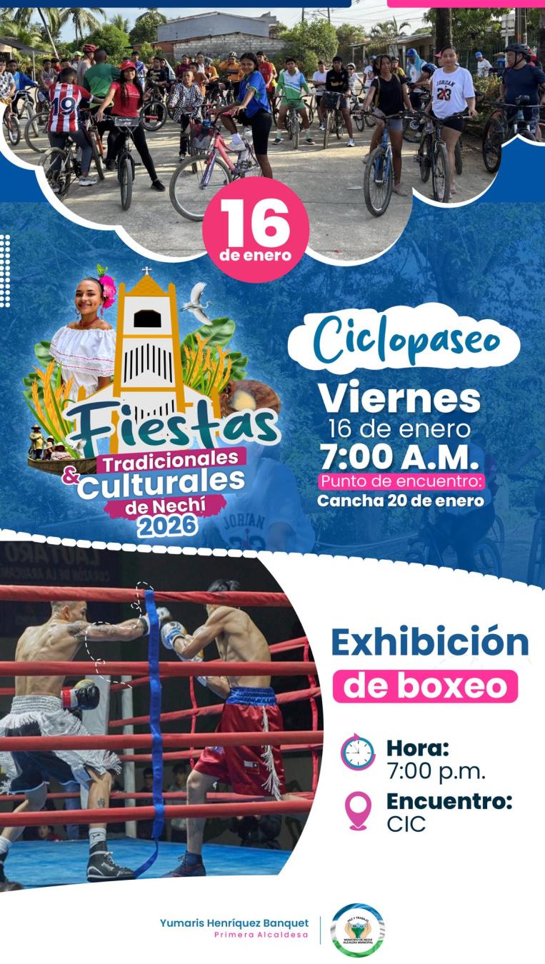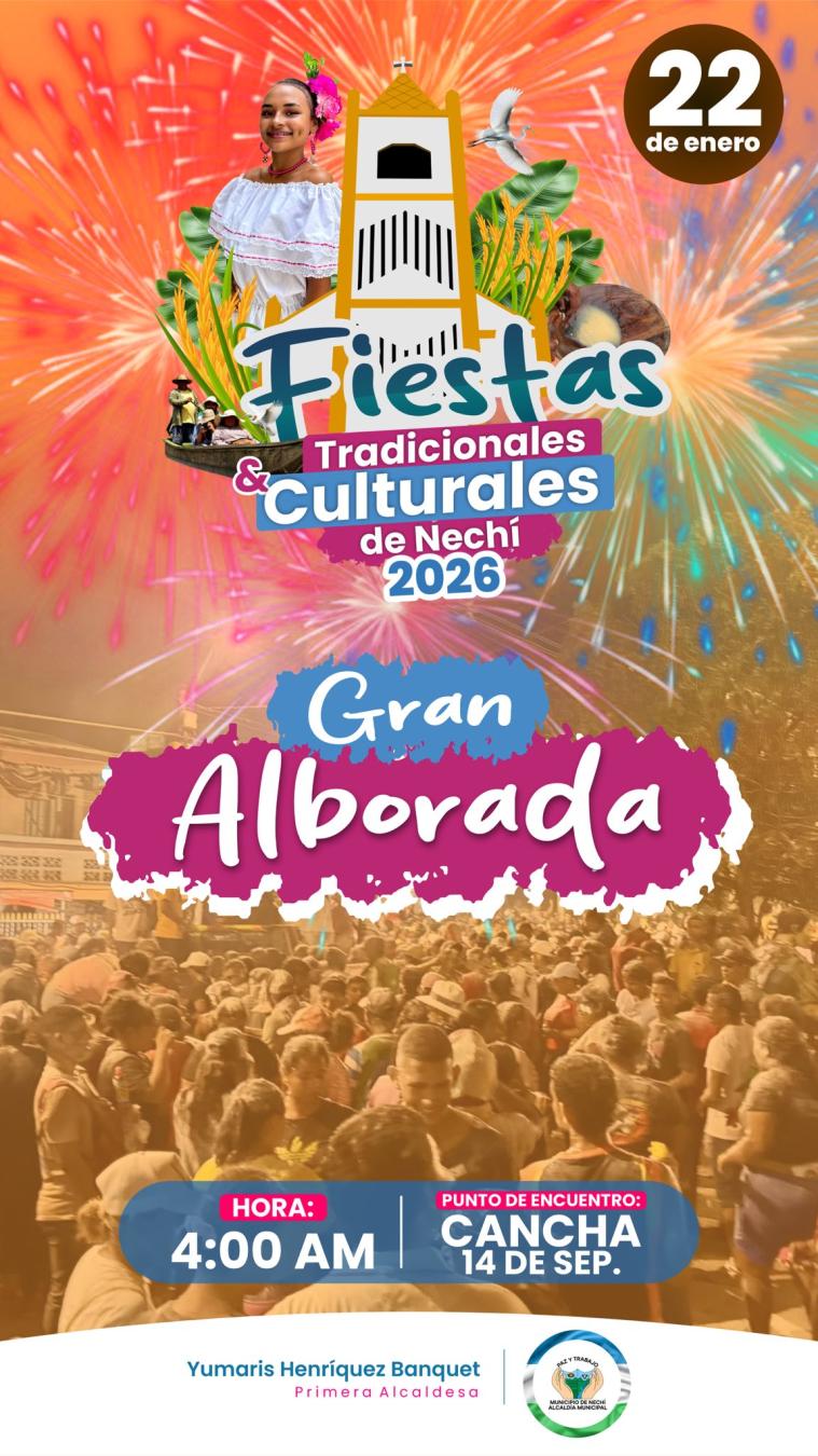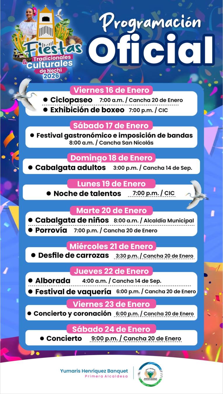 ¡La alegría vuelve a las calles de Nechí! Del 16 al 24 de enero, vive las Fiestas Tradicionales y Culturales de Nechí 2026 con una programación llena de tradición, música, sabor y arte popular. Cada día será una celebración única de nuestra identidad cultural: ciclismo, boxeo, festivales gastronómicos, cabalgatas, porrovía, carrozas, conciertos, noche de talentos y mucho más.