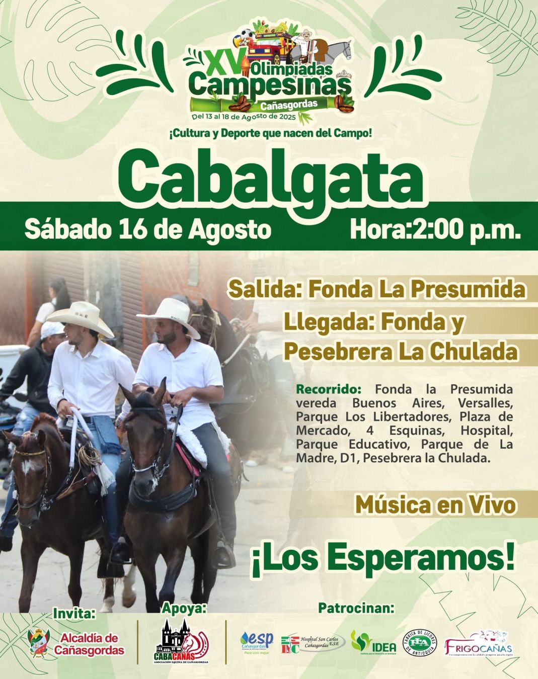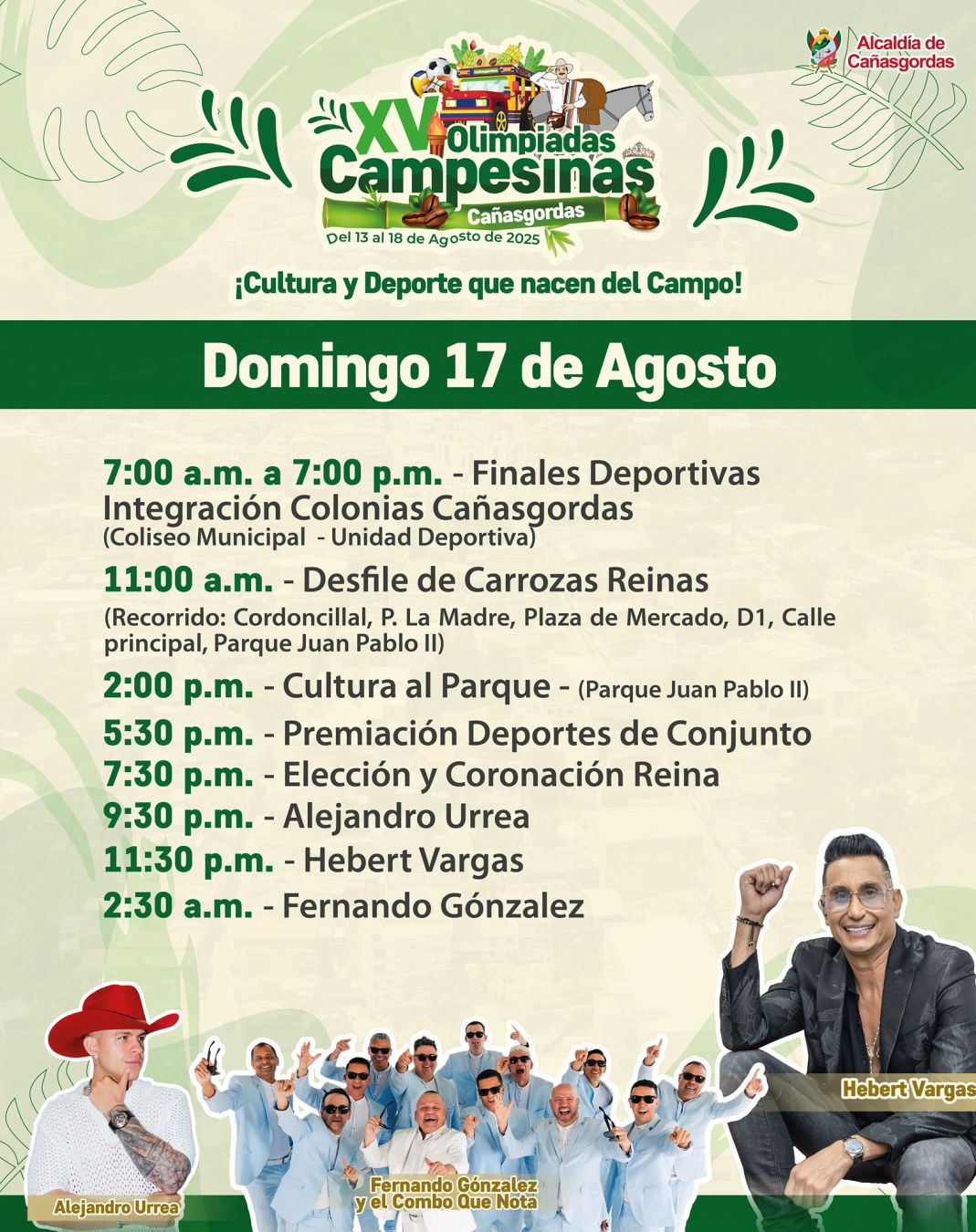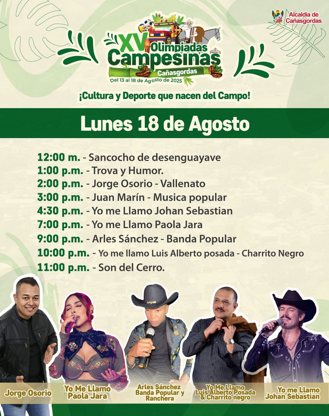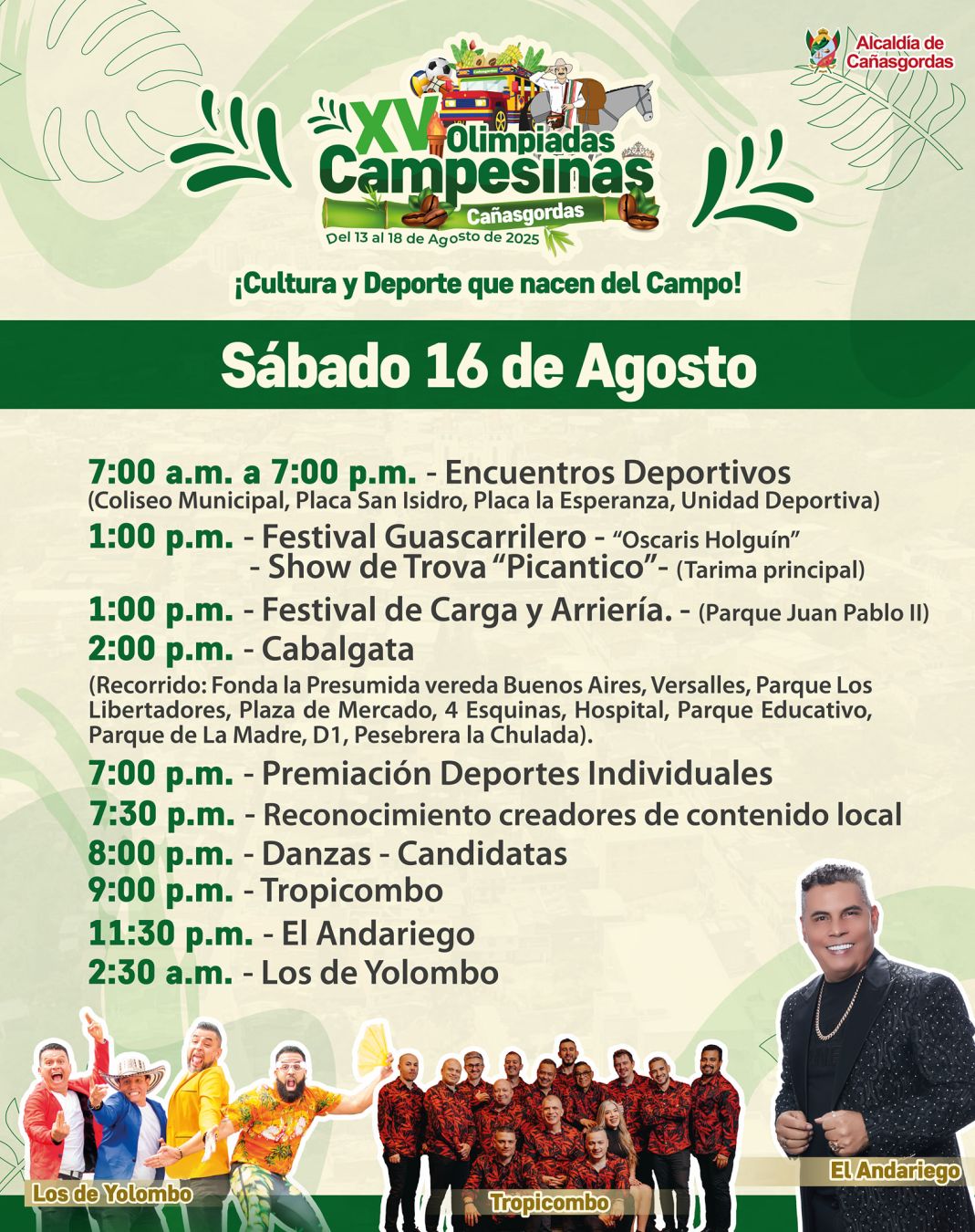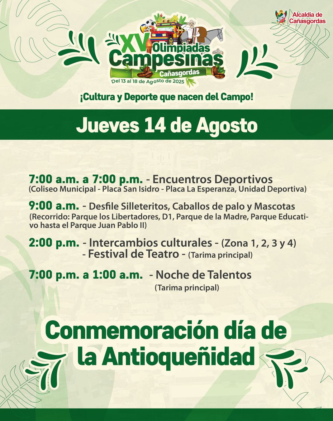 ¡Vive la tradición y la alegría del campo en las XV Olimpiadas Campesinas de Cañasgordas! Del 13 al 18 de agosto de 2025 celebraremos la cultura, el deporte y el talento rural con muestras culturales, festival guascarrillero, reinado popular, jornadas deportivas y artistas locales. Una semana para compartir, competir y fortalecer la unión de nuestras veredas.