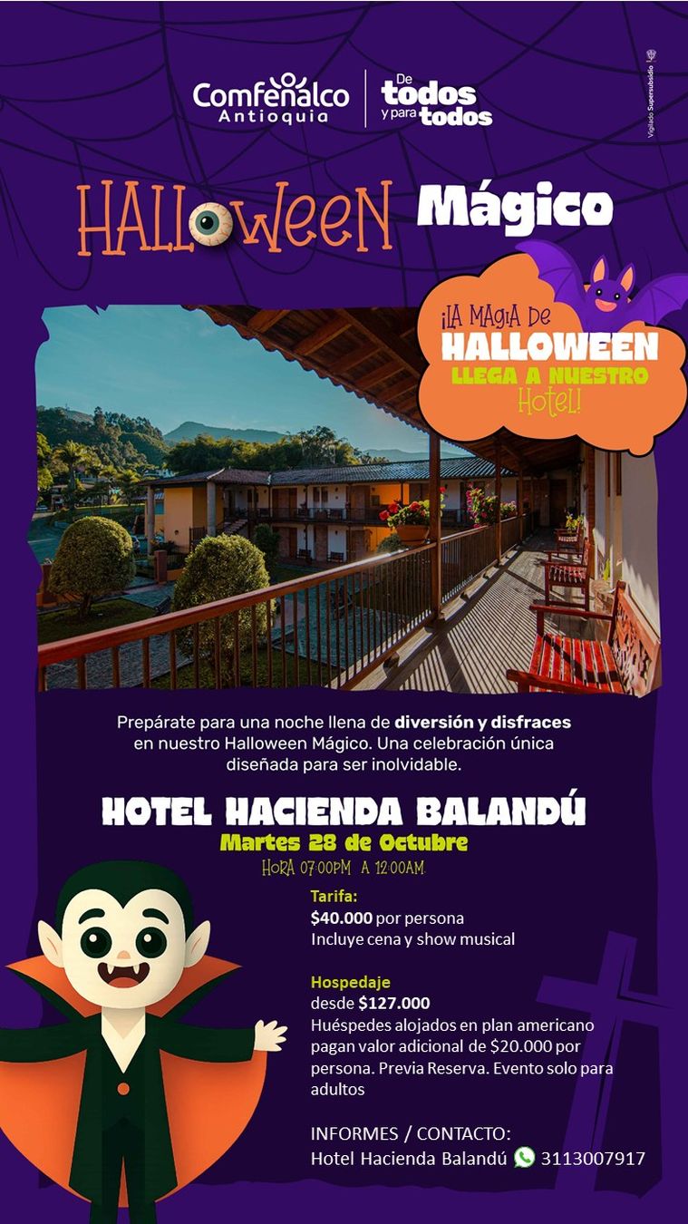 ¡Una noche exclusiva llena de magia, música y sabor te está esperando! Disfruta de un Halloween para adultos con cena especial, show en vivo y un ambiente encantador. Prepárate para vivir una experiencia única en un lugar mágico.