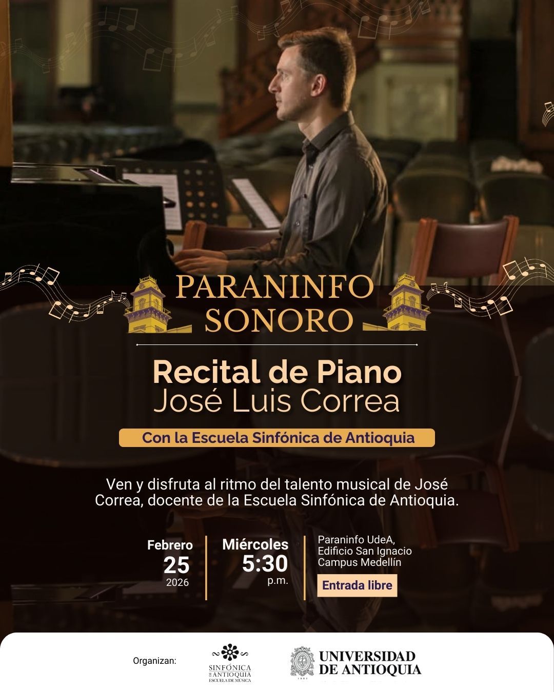 El maestro José Luis Correa presenta un recital íntimo de piano en el histórico Paraninfo UdeA. Tradición, emoción y música clásica en el corazón del Centro de Medellín. Entrada libre. ¡Deja que el sonido te atraviese!