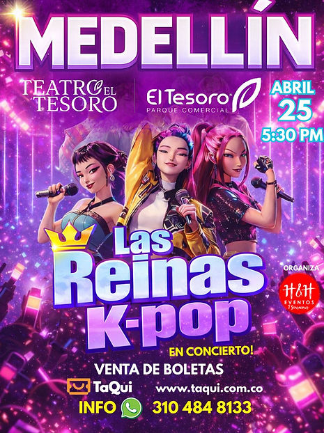 ¡Las Reinas K-Pop conquistan Teatro El Tesoro! Coreografías imparables, voces potentes y energía pink que te hará bailar sin parar. Vive la fiebre coreana en Medellín