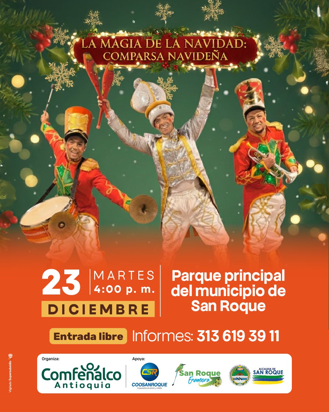 Comparsa navideña, música, personajes y la visita especial de Papá Noel. Ven con tu familia a vivir una tarde mágica, alegre y llena de espíritu navideño. Parque Principal de San Roque. Entrada libre. ¡Una navidad para recordar!