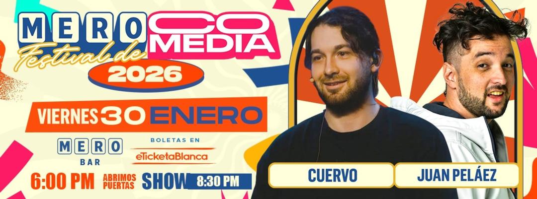 ¡Venite al Mero Festival de Comedia 2026! Prepárate para una noche de carcajadas en Mero Bar con Cuervo y Juan Peláez, humor sin filtro, buena música y tragos desde las 6:00 p.m. Conseguí ya tus boletas y arrancá el año riéndote a lo grande.
