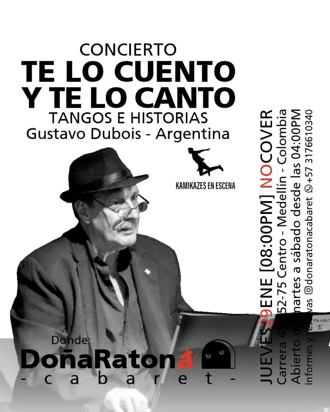 Prepárate para una noche única donde el tango se convierte en relato y la historia en canción. Desde Argentina, Gustavo Dubois te hará vivir un íntimo viaje emocional con música y palabras que tocan el alma. ¡No te lo puedes perder!
